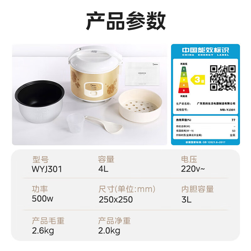 商品名称:美的(Midea)电饭煲MB-WYJ301家用机械煮饭锅3升大容量煮饭自动保温不粘内胆电饭锅