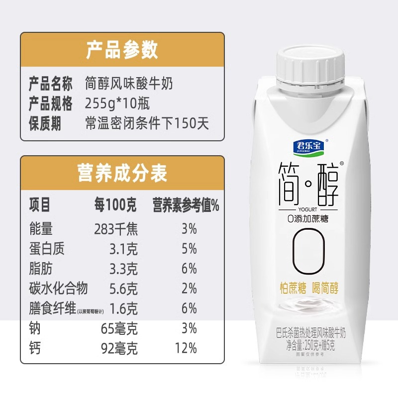 商品名称:君乐宝简醇0蔗糖酸奶梦幻盖255g*10瓶 0添加蔗糖轻盈无负担 低GI值